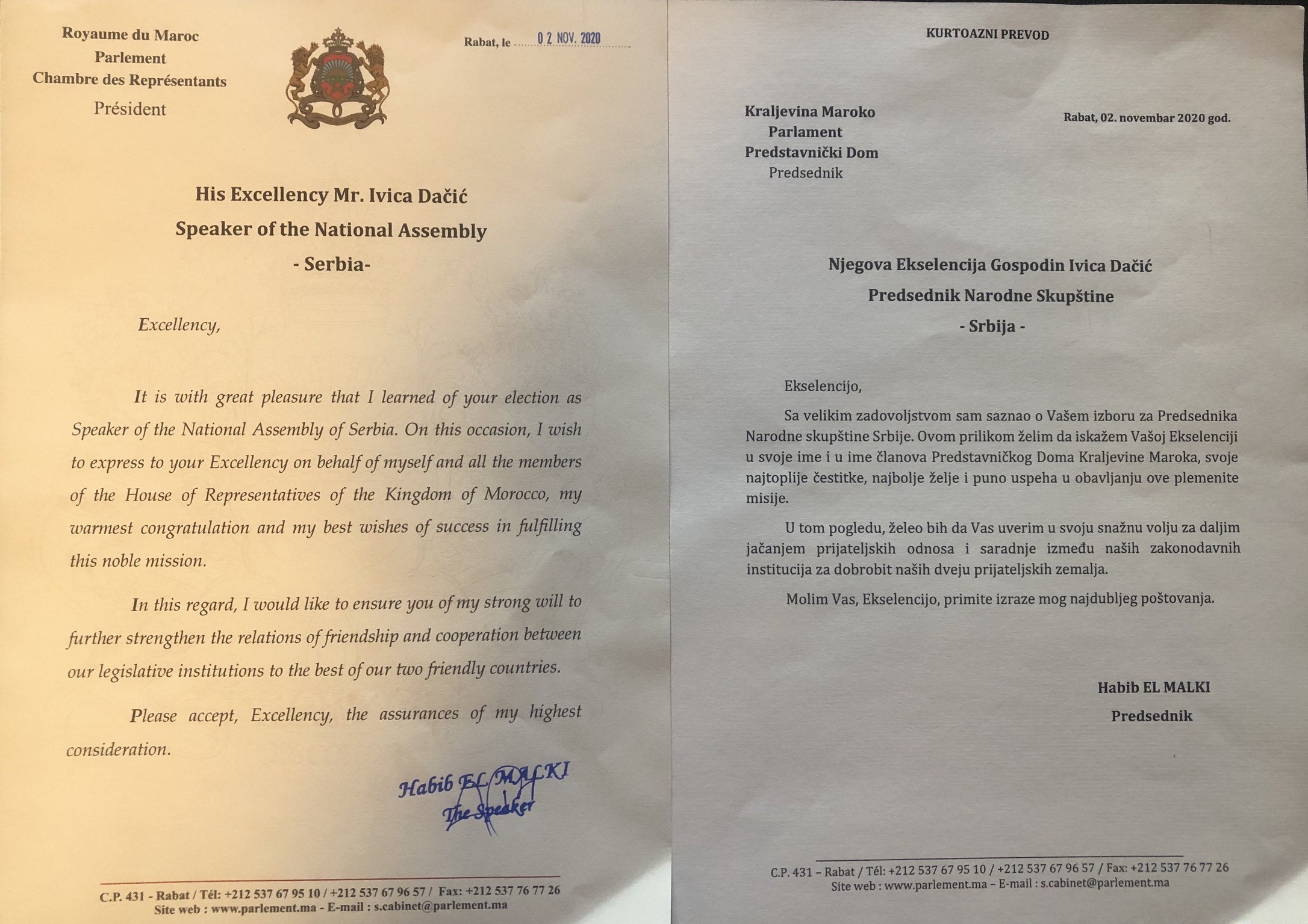 Амбасадор Белхaж честитао је ступање на нову дужност председнику Народне скупштине и уручио писма председника Представничког Дома Марока Хабиб Ел Малкиja и министра спољних послова Марока Насера Бурите. Пренео је поздраве шефа дипломатије Марока Н.Бурите који у свом писму захваљује на личном доприносу Ивице Дачића унапређењу билатералних односа, али и јачању пријатељских веза између две државе и два народа.
