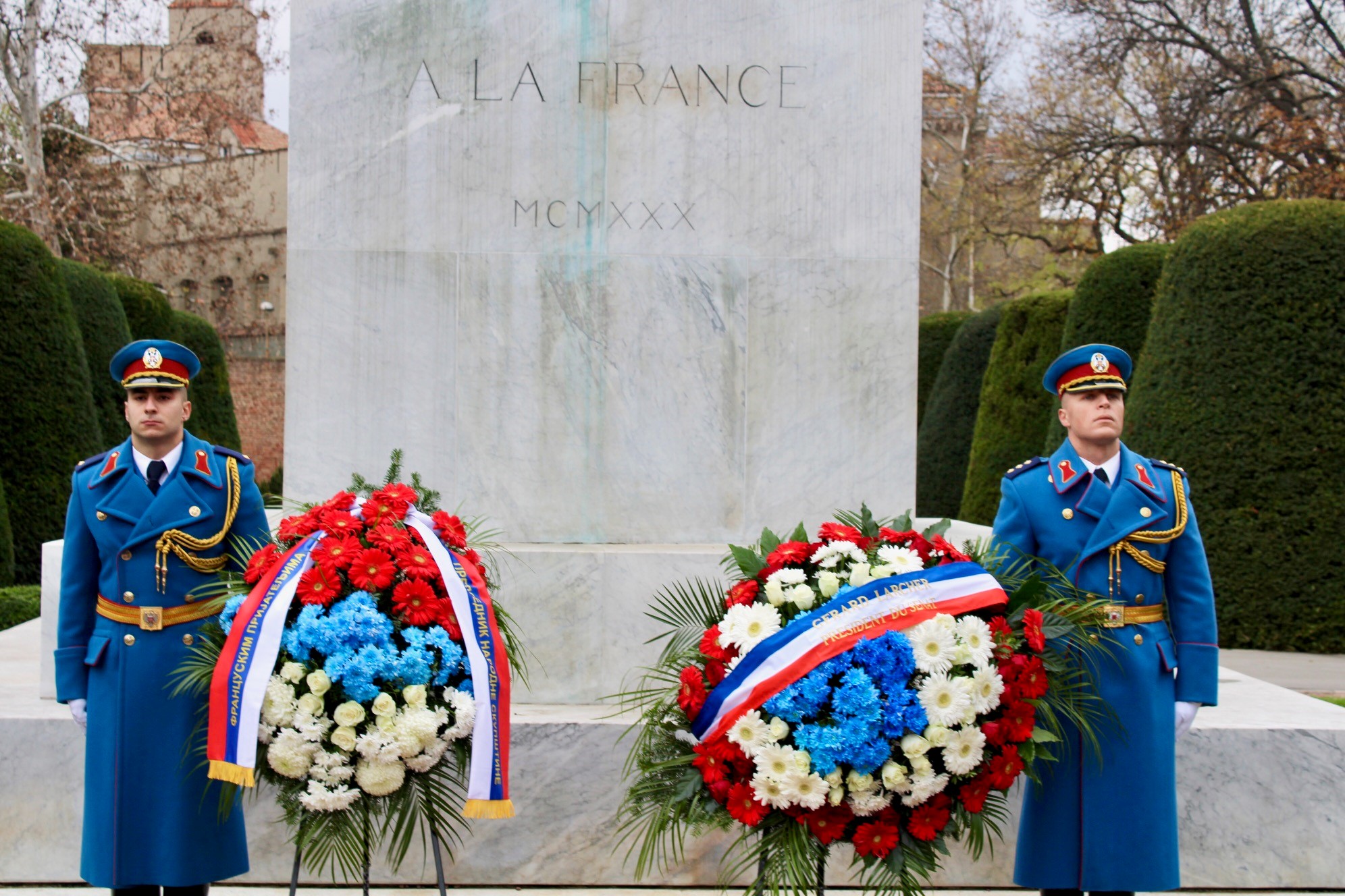 Председник Народне скупштине др Владимир Орлић и председник Сената Републике Француске Жерар Ларше положили су данас венце на Споменик захвалности Француској, на Калемегдану.