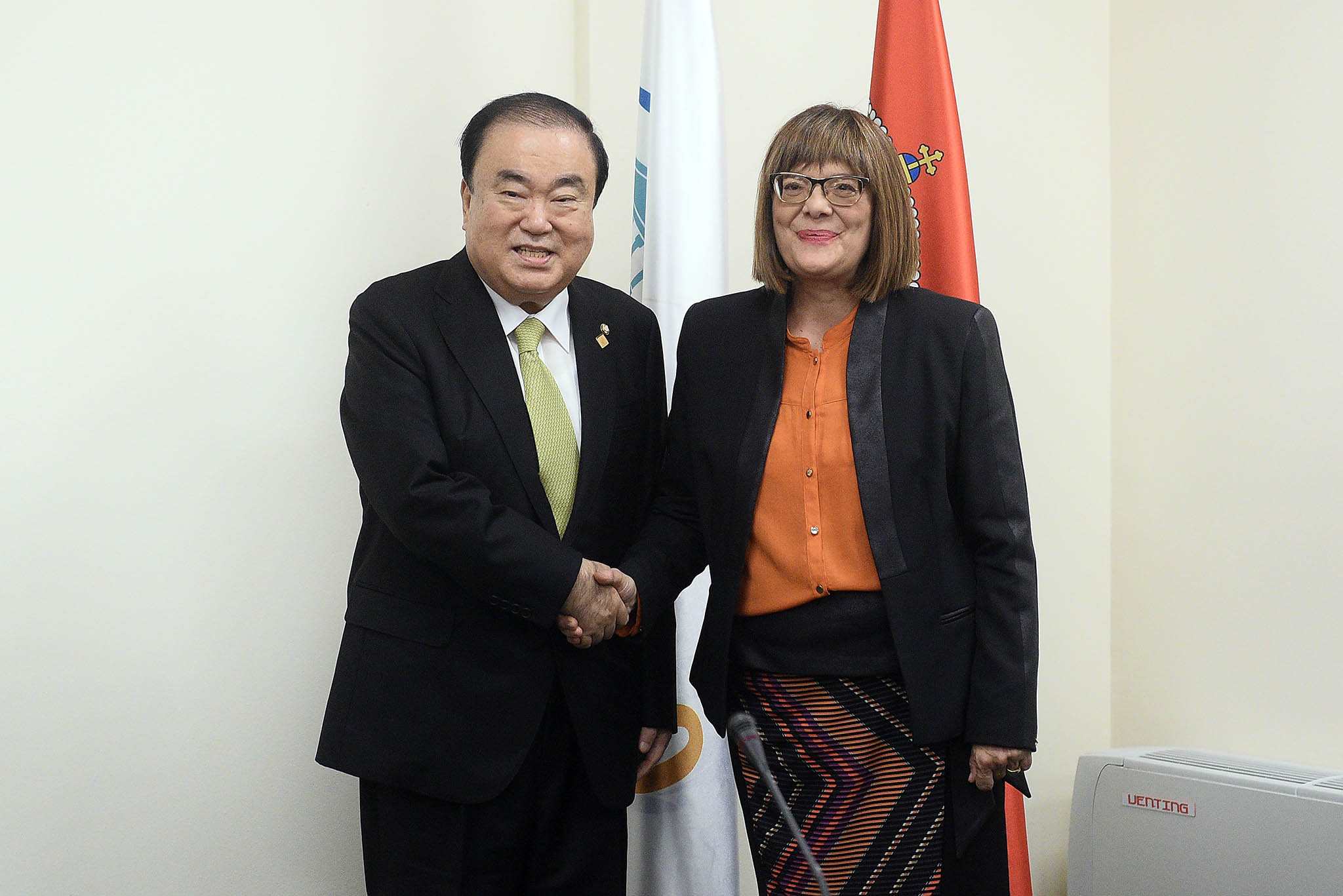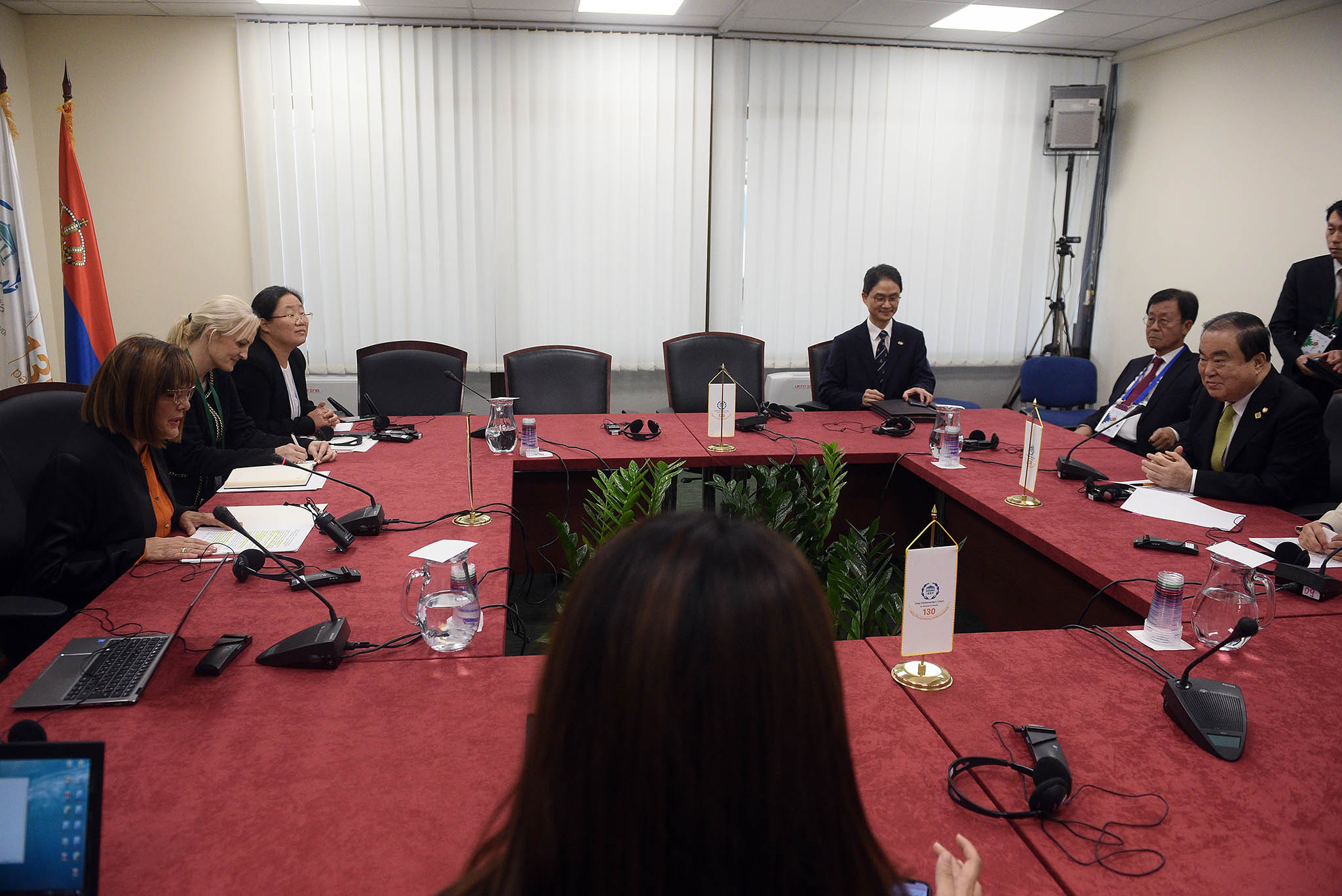 Predsednica Narodne skupštine Republike Srbije Maja Gojković sastala se sa predsednikom Narodne skupštine Republike Koreje Hi Sangom Munom, kome je zahvalila na učešću delegacije Republike Koreje na 141. zasedanju IPU.