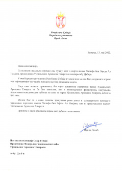 Председник Народне скупштине Републике Србије Ивица Дачић упутио је саучешће поводом смрти шеика Халифа бин Заједа Ал Нахјана, председника Уједињених Арапских Емирата и владара Абу Дабија.