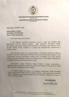 12. фебруар 2021. Честитка председника Народне скупштине Републике Српске Недељка Чубриловића поводом Дана државности